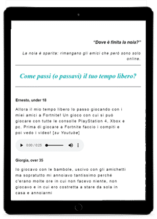 Perché bisogna proprio ascoltarle le voci – ed immaginarsi chi c’è dietro le voci – mentre raccontano le proprie esperienze giovanili in rapporto col tempo libero, la scuola e l’informazione prima e dopo l’avvento del Digitale.