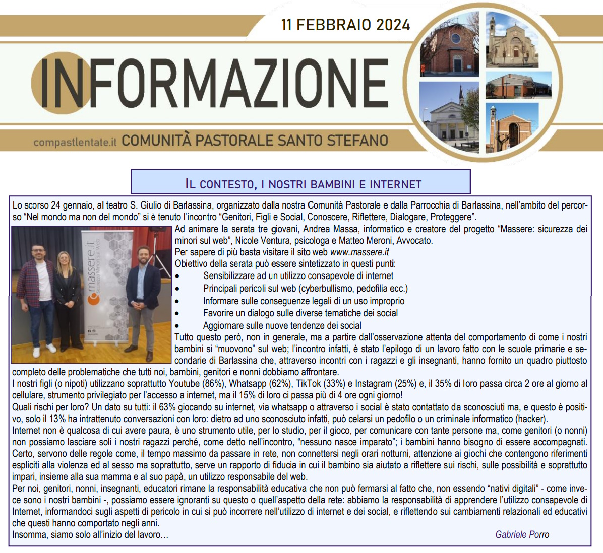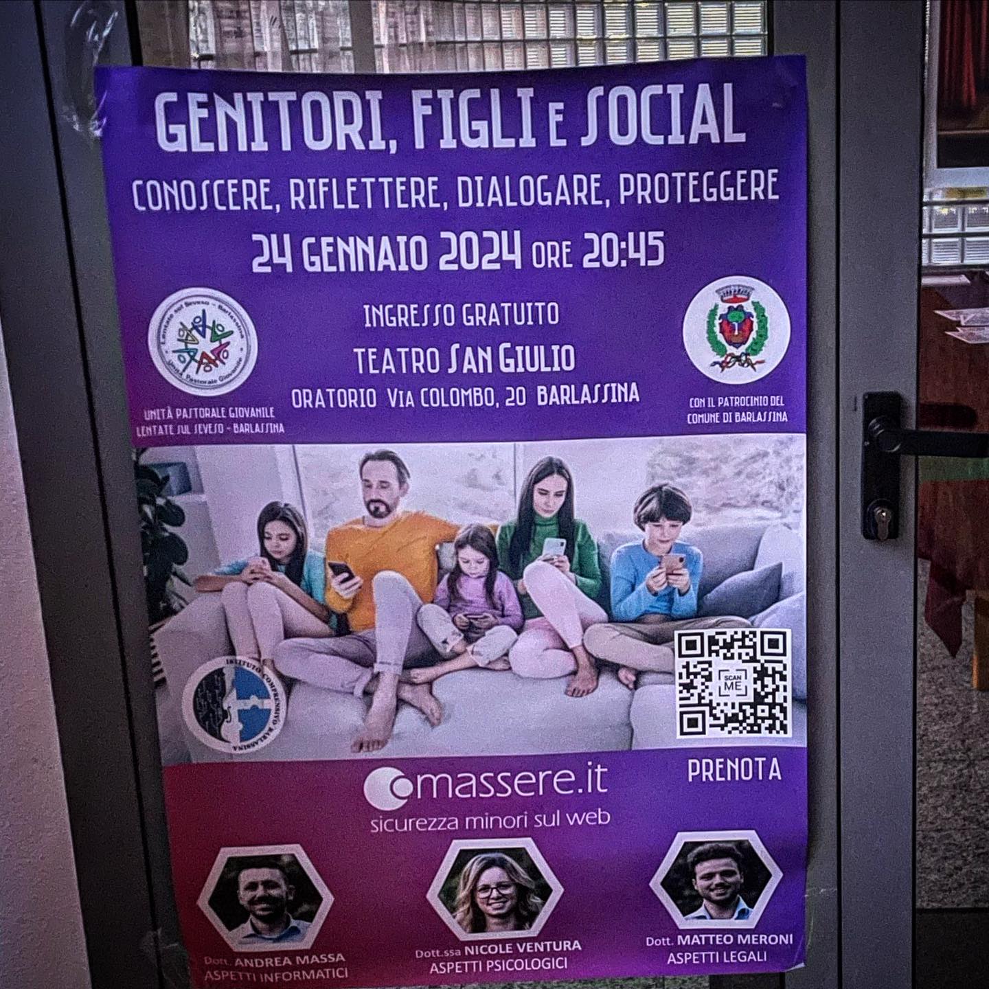 l'Unità Pastorale Giovanile Barlassina / Lentate sul Seveso organizza in collaborazione con l'Istituto Comprensivo di Barlassina ed il patrocinio del Comune di Barlassina una serata gratuita aperta a tutti i genitori a cura di Progetto MASSERE – Sicurezza dei Minori sul Web dal titolo: GENITORI, FIGLI E SOCIAL. Conoscere, riflettere, dialogare e proteggere.