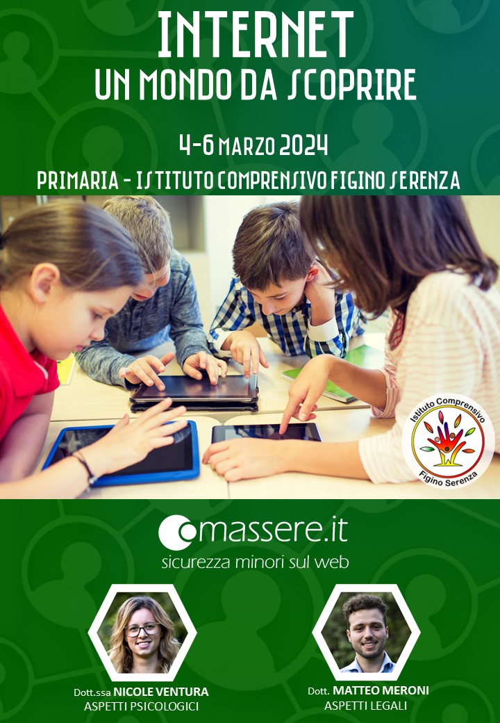 In collaborazione con l'Istituto Comprensivo di Figino Serenza nel mese di marzo abbiamo inontrato prima gli alunni della scuola primaria e successivamente 18 marzo 2024 presso SCUOLA PRIMARIA Don Vittorio Bonacina via Garibaldi MONTESOLARO (CO) abbiamo concluso con una serata gratuita dedicata ai genitori della primaria dal titolo: SOCIAL: UN DIALOGO APERTO. Conoscere, riflettere, dialogare e proteggere.