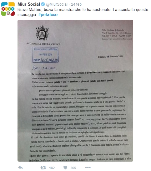 WEB, carta stampata e TV si sono occupati del caso #PETALOSO, un bambino di terza elementare inventa la parola "petaloso" e la maestra chiede il parere dell'Accademia della Crusca. La risposta non si è fatta attendere e l'insegnante ne ha postato il contenuto su Facebook, scatenando un passaparola che in poche ore è rimbalzato sui maggiori social.