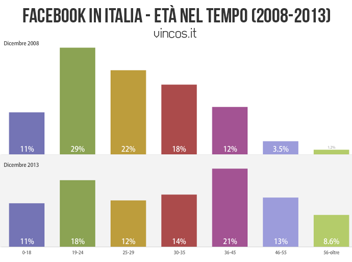 In questi anni è rimasta pressoché inalterata la suddivisione tra uomini e donne, rispettivamente al 52% e al 46%, con una quota di un 2% di non classificati. Invece ciò che è mutata profondamente è stata la composizione delle età degli iscritti. I primi colonizzatori di Facebook sono stati i 19-24enni che nel 2008 rappresentavano ben il 29% di tutta la popolazione iscritta. Insieme a loro i 25-29enni che erano il 22%.