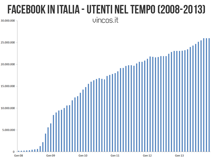 Oggi gli italiani che visitano Facebook al meno una volta al mese sono 26 milioni. Quelli che lo fanno almeno una volta al giorno sono 17 milioni. Negli ultimi dodici mesi si è avuto un incremento della consultazione in mobilità tanto che oggi gli utenti mensili da mobile sono 16 milioni, quelli giornalieri 10 milioni.